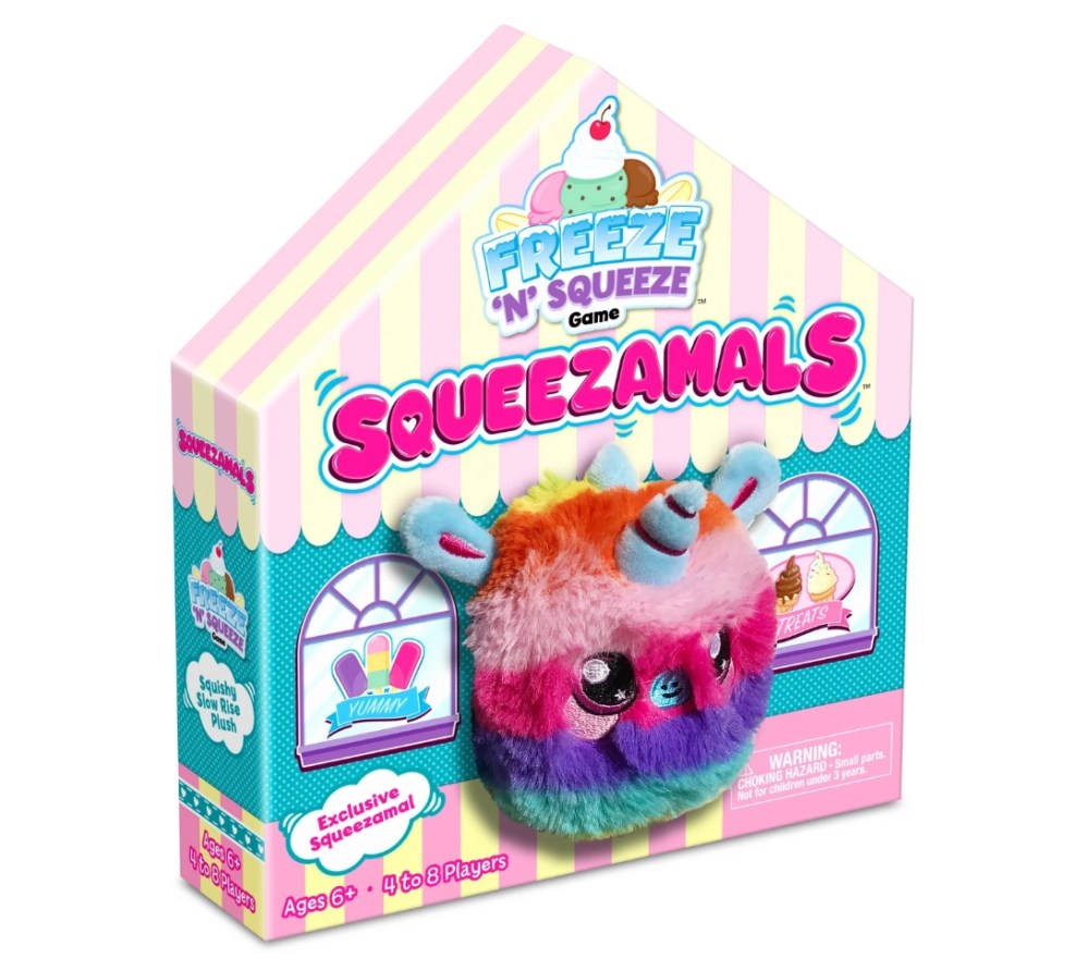 Squeezamals Freeze ‘N’ Squeeze Game is an entertaining twist on the classic game of hot potato. Players take turns making a yummy treat for their Squeezamal to enjoy. The player caught holding the plush when it’s time to eat must pay for the treat! Each game features an exclusive Squeezamal!