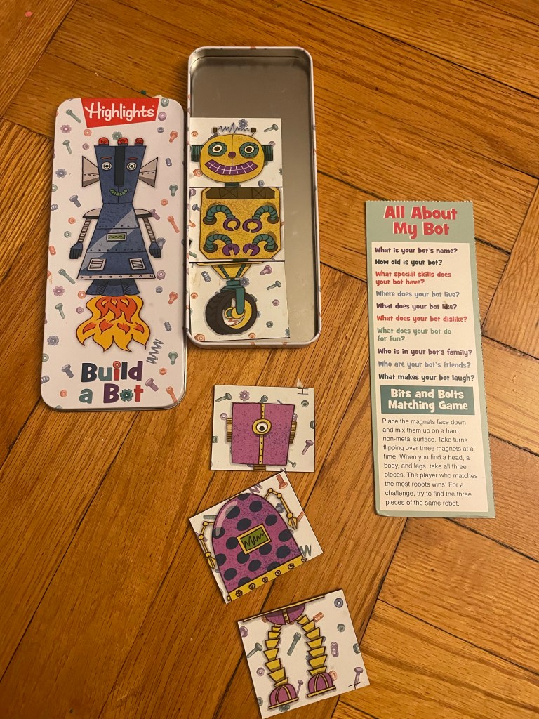 Highlights Build a Bot-How many robot combinations will your child make with the Highlights Magnetic Build a Bot Tin? Kids can mix and match the 12 magnetic pieces to find more than 100 possible ways to create a bot! For even more fun, make up personalities and stories to go with each creation. Pieces can be stored inside the tin when kids are done.Bendy Figs- my son gets car sick so we cant utilize books or tablets. One thing that has come in handy for car rides is figures. We give him lots of options so he can still have fun without getting sick! Bendy Figs are super durable and will last lots of play. Bugs Bunny is a great choice for Easter! https://amzn.to/3jcn5yECelebrate Easter with the Chocolate Bunny Popper! Squeeze the Popper toy to shoot a soft foam ball up to 20 feet! The Hog Wild Bunny Popper is super cute and fun! https://amzn.to/3Ki9n9kKids love Kinder Eggs. We brought back these from a recent trip to Europe, but the ones sold in the US also include a toy in slightly different design. Perfect for baskets and easter egg hunts!Egg Mazing is a cool fun way to decorate your eggs! Creative artistic designs easy for little hands. It spins and adds color with a marker. https://amzn.to/3Kj2LY7
