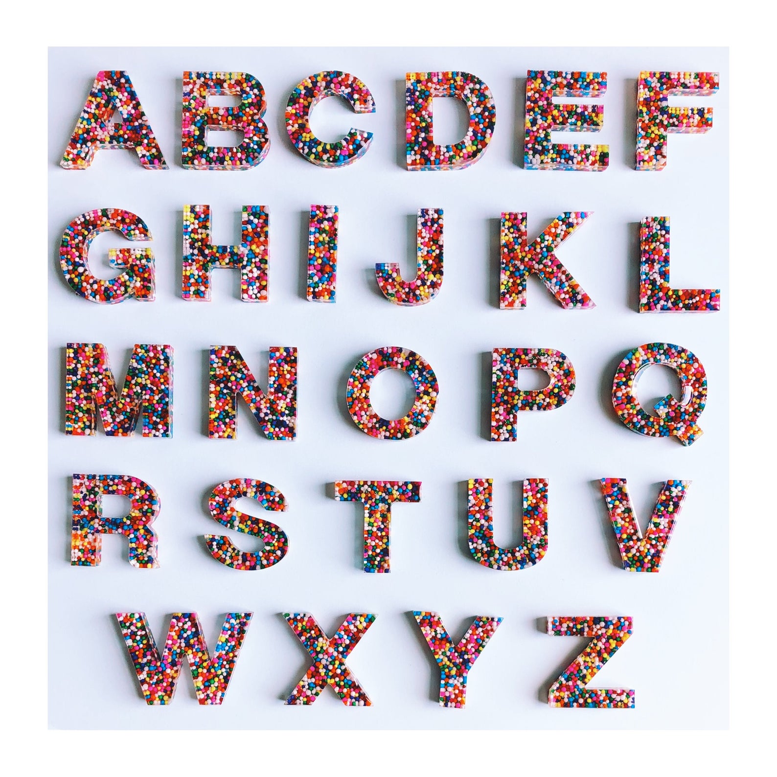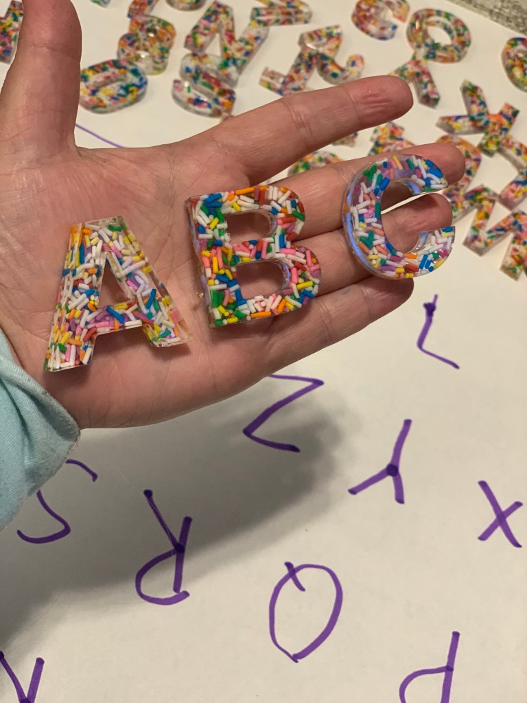 Sensory Letters are perfect for those who want to bring some fun to literacy. For preschoolers, use in a sensory bin or on a light table to explore letter recognition in an authentic way. For older children, bring to the park or use at home to make sight word and spelling fun. These letters are a handcrafted keepsake that will be fun for the years to come. Each set is handmade and full of wonder.